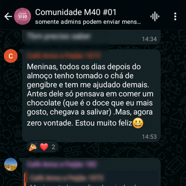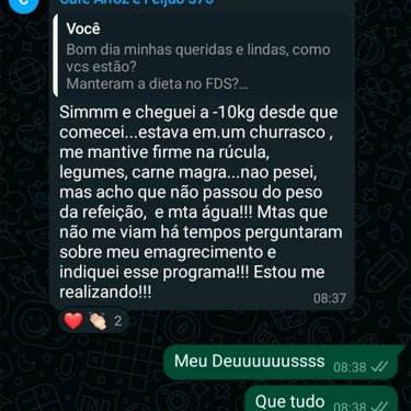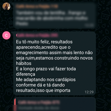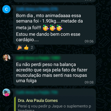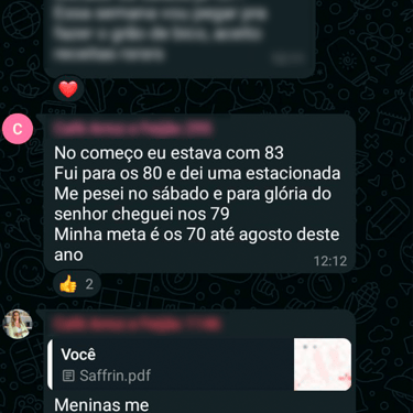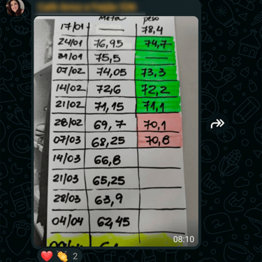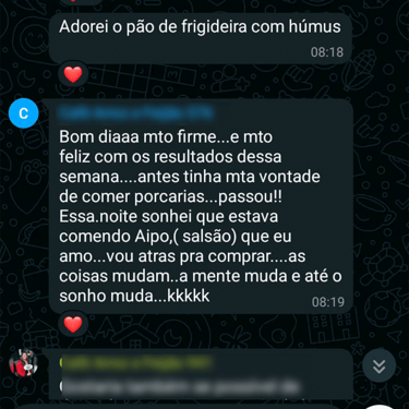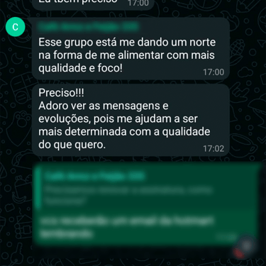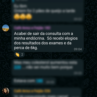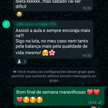 Acesso ao grupo de whatsapp exclusivo, onde a nutri acompanha os comentários e feedbacks para montar suas aulas. O grupo é um espaço onde as mulheres se motivam compartilham experiências.